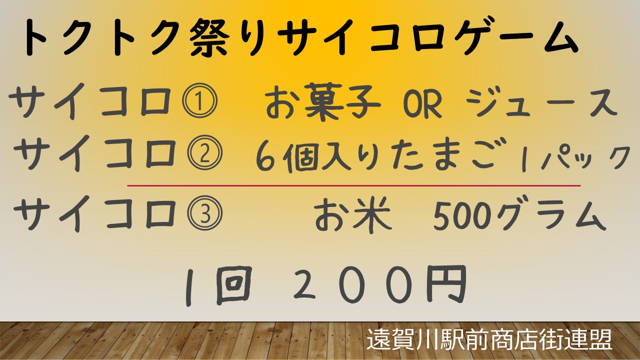 今年もやります!遠賀川駅前商店街連盟サイコロゲーム! 送る ツイート シェア 【日時】 2025/11/30(日曜日) 13:00~ 【場所】 遠賀町コミュニティセンターおんが得トクまつり本部前 1回200円でサイコロをふって出た目で景品もらえます 外れはありません サイコロ⓵ お菓子orジュース サイコロ⓶ 6個入りたまご1パック サイコロ⓷ お米500グラム ※無くなり次第終了です
